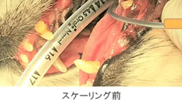 口腔内検査で、重度の歯石の付着、歯の動揺、歯肉の重度後退、鼻腔につながる穴が数か所確認された。レントゲンで歯根吸収病巣も認められた。