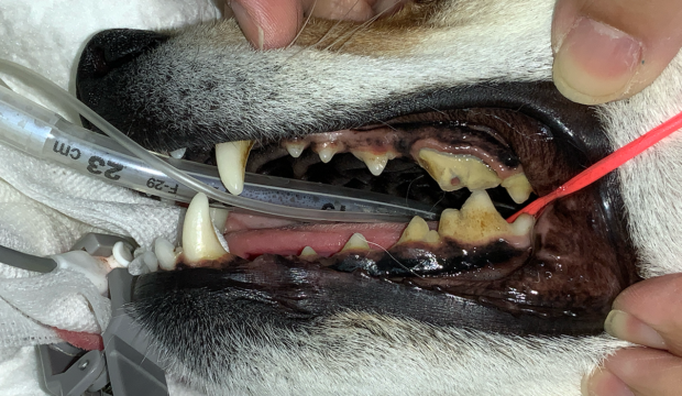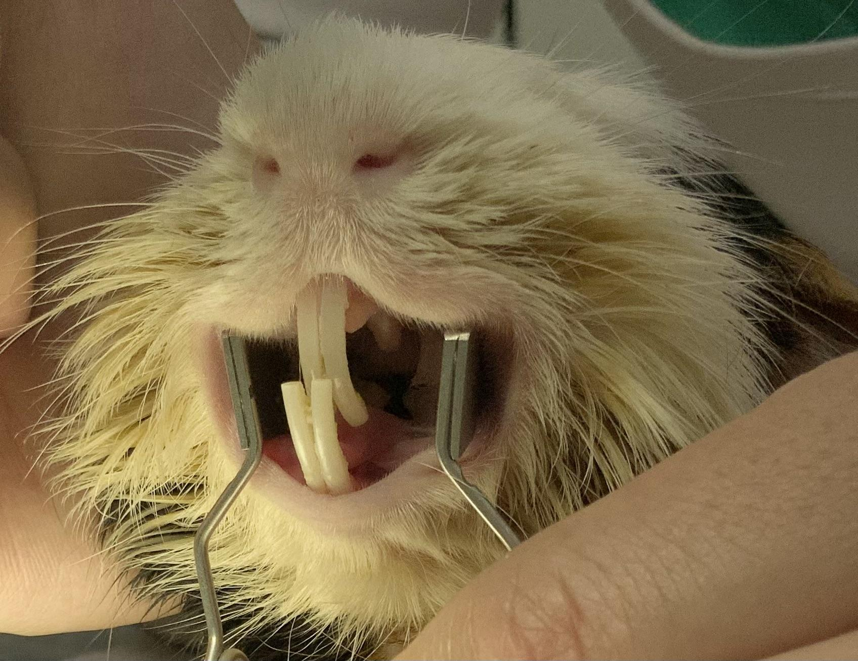 これらの過長した歯を削ることで、よだれや痛みの原因が取り除かれました。処置後にこの子は食欲を取り戻し、体重も増えて元気になりました。