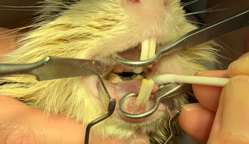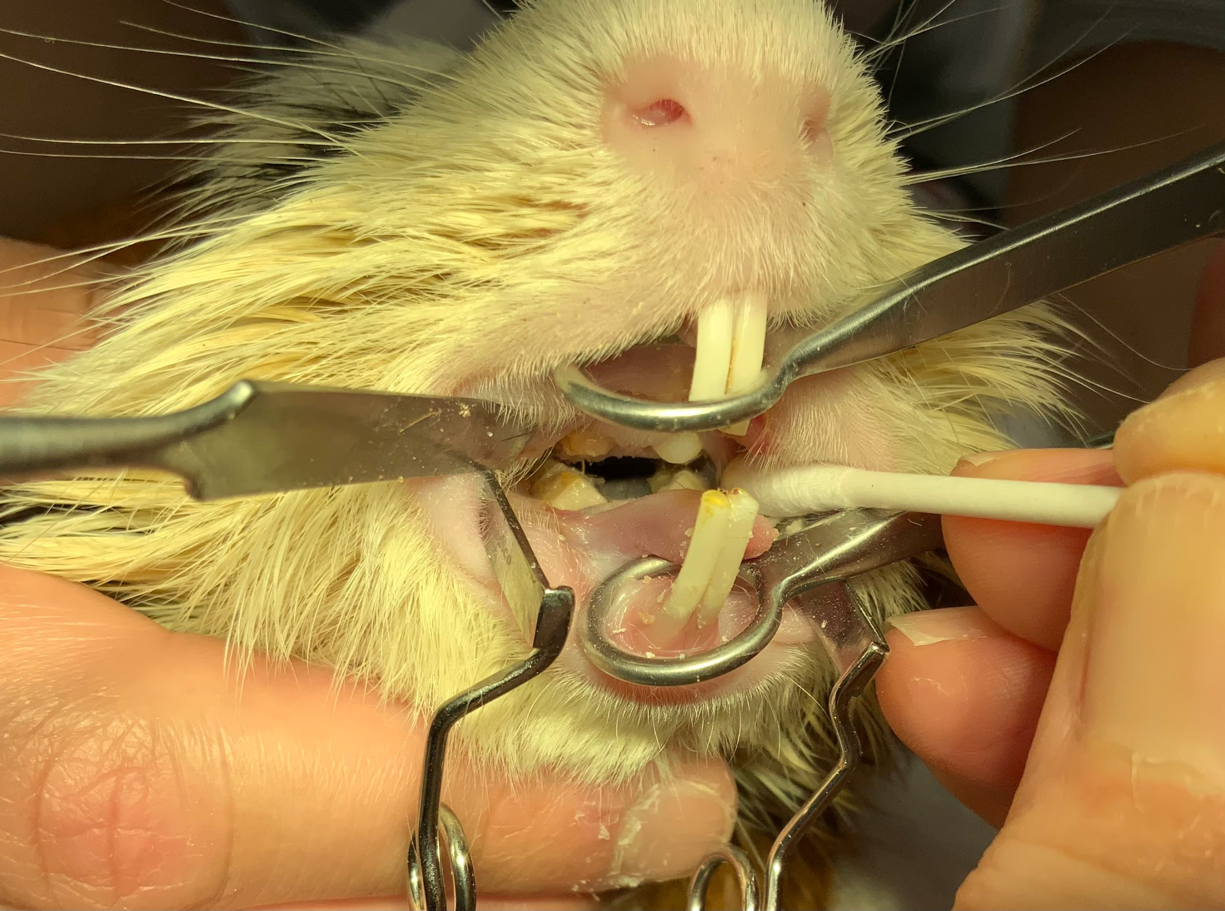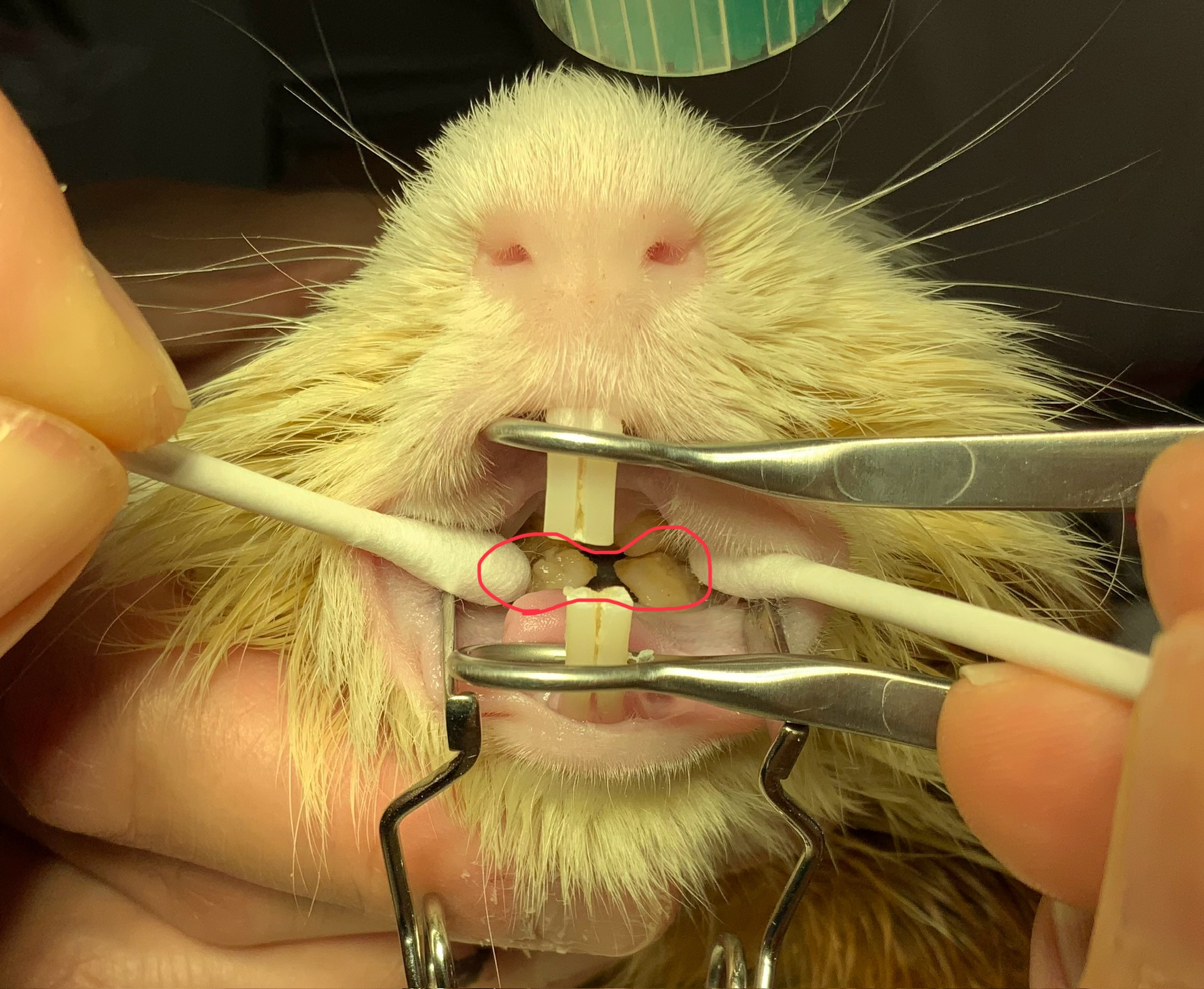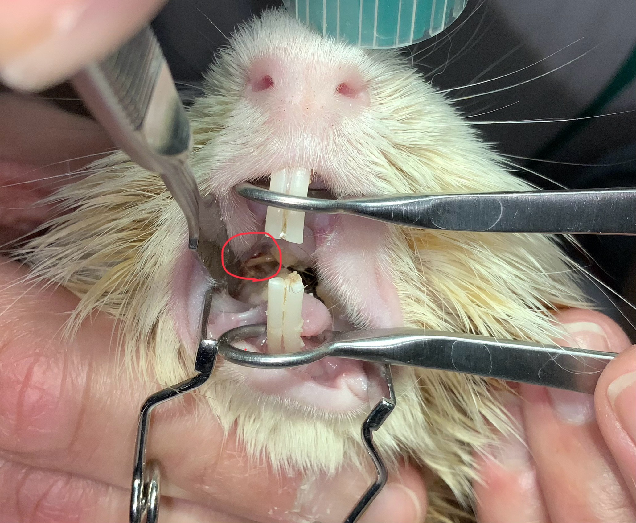 | 齧歯目テンジクネズミ科に属するモルモットは、切歯(前歯)と臼歯(奥歯)のどちらも一生伸び続ける動物です。それ故、歯の病気も多く、病院に来院する主訴(食欲不振やよだれ)との関連も頻繁に見られます。 この症例も4ヶ月もの長い間、よだれと食欲不振が見られ、来院された時は自力では全く食べずかなり痩せていて、よだれまみれでした。口腔内の観察によって歯の過長が疑われ、全身麻酔下での処置を行いました。 |