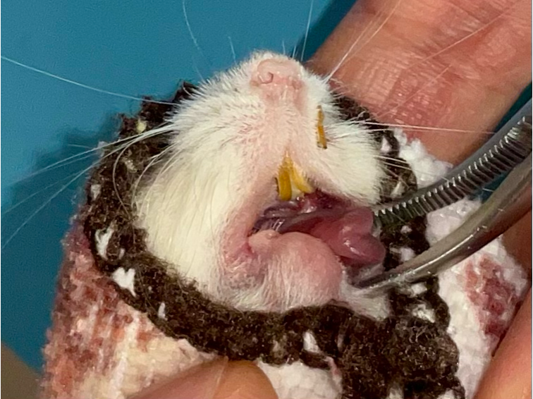 ・特に左上顎の切歯(前歯)の過長が重度、丸まって口蓋に刺さり顔面まで飛び出ている
